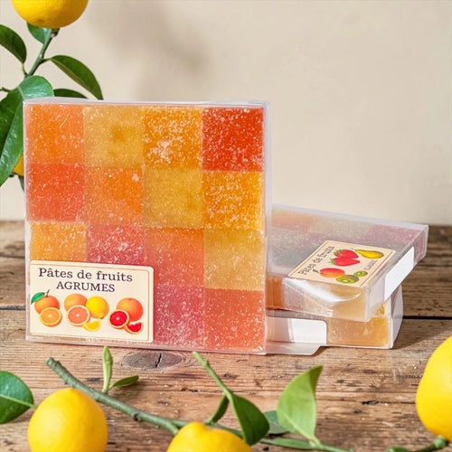Un coffret identitaire et solaire, pensé comme une invitation au voyage. Le Damier Corse réunit 16 pièces de pâtes de fruits artisanales, cuites lentement au chaudron puis découpées avec précision, pour une dégustation fondante et intensément parfumée.