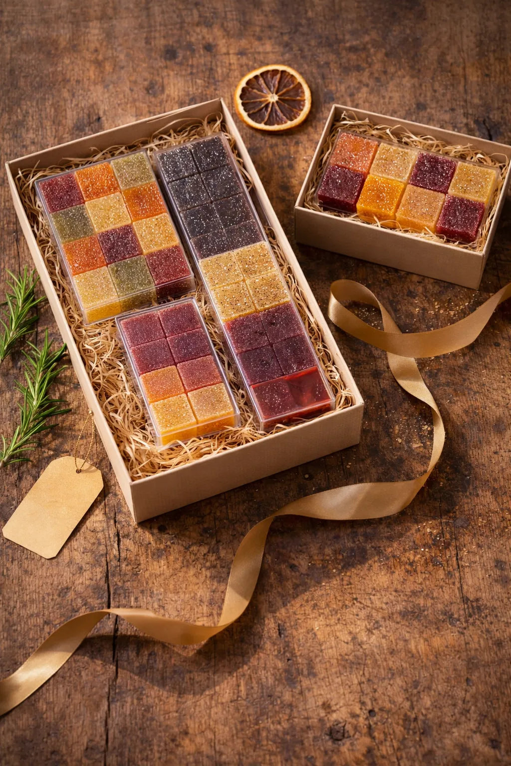 La différence se joue sur la finition : les pâtes de fruits sont enrobées de sucre après découpe, tandis que les gelées sont conditionnées sans enrobage, pour une texture plus lisse et une dégustation plus délicate.